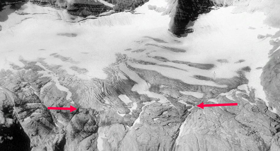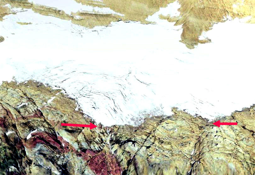 1990 Google Earth image with two main terminus lobes indicated by red arrows.