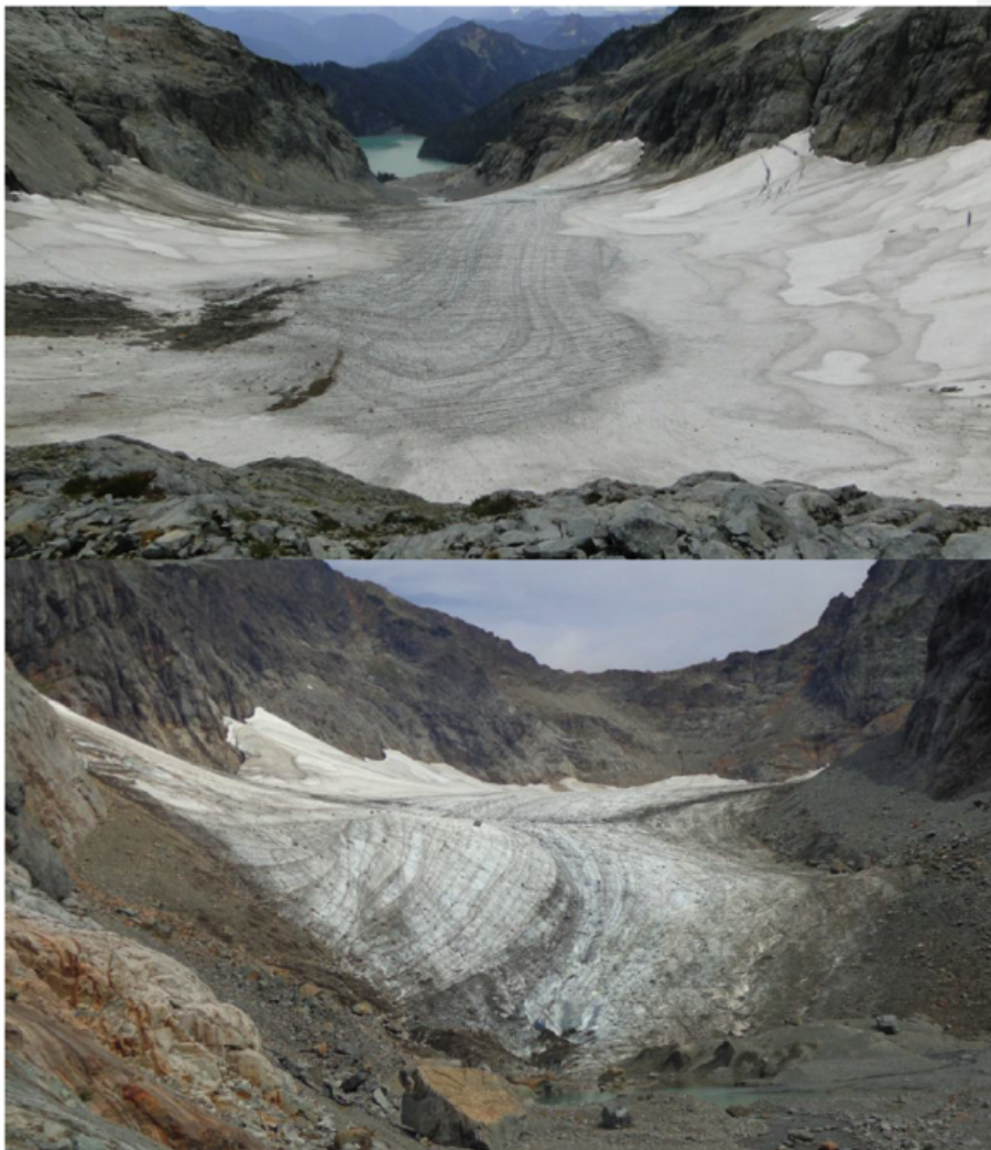 The cumulative mass balance loss from 1980-2015 is 18.8 m, the equivalent of cutting a 20.5 m thick slice off the top of the average glacier (Figure 1).  The trend is remarkably consistent from region to region (WGMS, 2015).  The decadal mean annual mass balance was -261 mm in the 1980’s, -386 mm in the 1990’s, 727 mm for 2000’s and -818 mm from 2010-2015.  The declining mass balance trend during a period of retreat indicates alpine glaciers are not approaching equilibrium and retreat will continue to be the dominant terminus response (Zemp et al., 2015). The recent rapid retreat and prolonged negative balances has led to many glaciers disappearing and others fragmenting (Pelto, 2010; Carturan et al, 2015).