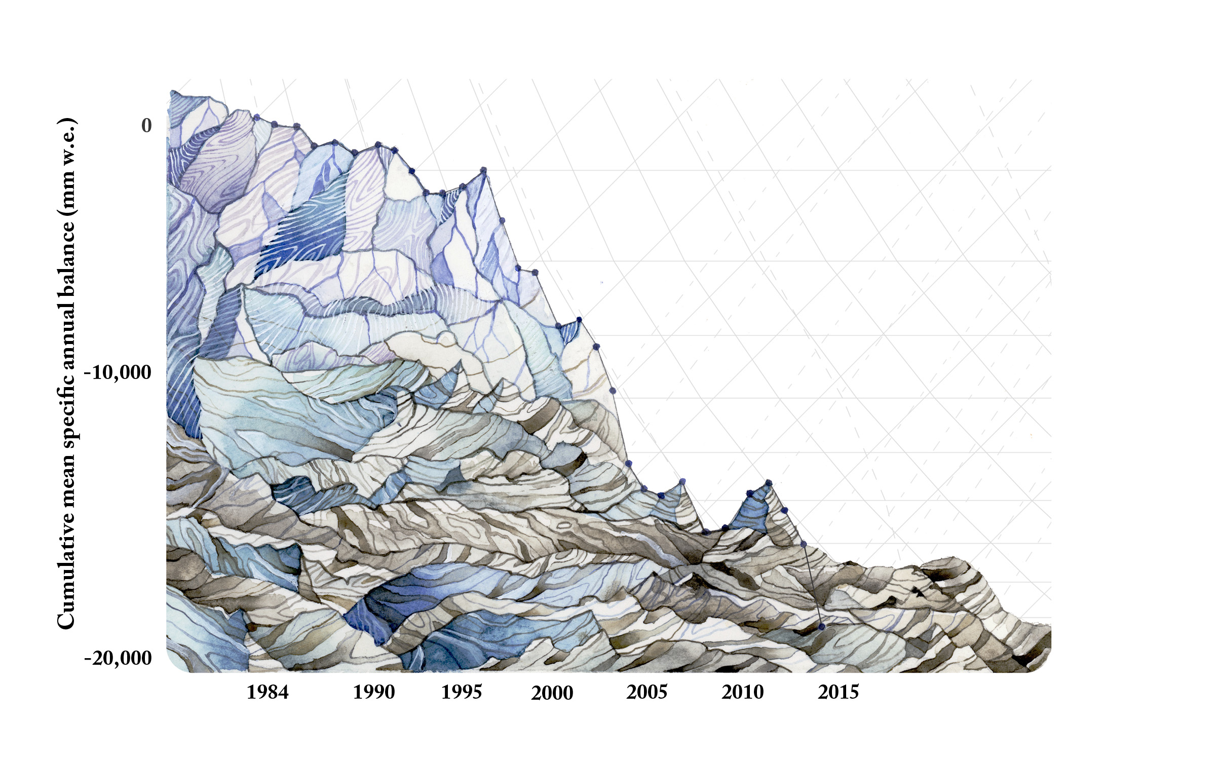 BAMS State of Climate 2015 asked me about featuring some of the glacier images for the cover, and I countered with a suggestion to utilize one of a series of paintings by Jill Pelto that illustrate the impact of climate change magnifying the impact of the data.  Below are sections of this years report that focus on glaciers.