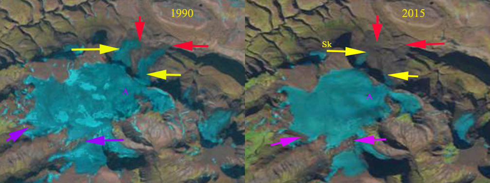 Among the seven glaciers for which 2014-2015 annual mass balance have been reported, the mass balances of glaciers in Alaska and Svalbard (three each) were negative, while the balance for Engabreen Glacier in Norway was positive. The pattern of negative balances in Alaska and Svalbard is also captured in time series of regional total stored water estimates, derived using GRACE satellite gravimetry, which are a proxy for regional total mass balance (ΔM) for the heavily glacierized regions of the Arctic (Figure 3). Measurements of ΔM in 2014-2015 for all the glaciers and ice caps in Arctic Canada and the Russian Arctic also show a negative mass balance year. The GRACE-derived time series clearly show a continuation of negative trends in ΔM for all measured regions in the Arctic. These measurements of mass balance and ΔM are consistent with anomalously warm (up to +1.5ºC) summer air temperatures over Alaska, Arctic Canada, the Russian Arctic, and Svalbard in 2015, and anomalously cool temperatures in northern Scandinavia, particularly in early summer (up to -2ºC). The warmer temperatures led to higher snowlines in the aforementioned regions as seen in images below.