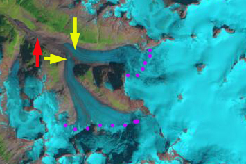 Klippi Glacier in Landsat image from 1995. Red arrows indicate 1987 terminus, yellow arrows 2016 terminus and purple dots the transient snowline.