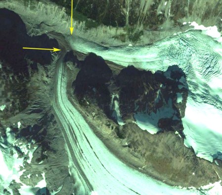 2012 Google Earth image of the terminus area of Klippi Glacier. Yellow arrow indicate 2016 terminus location.