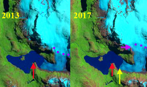 Dama Blanca Glacier in Landsat imags from 2013 and Sentinel image from Dec. 2016 Red arrow is the 1986 terminus, yellow arrow the 2017 terminus, purple dots the snowline and purple arrows a bedrock ridge.