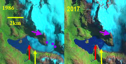 Dama Blanca Glacier in Landsat images from 1986 and 2017. Red arrow is the 1986 terminus, yellow arrow the 2017 terminus, purple dots the snowline and purple arrows a bedrock ridge.