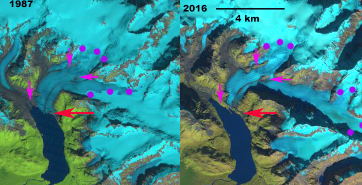 Fasset Glacier in 1987 and 2016 Landsat images. Red arrow indicates glacier front in 1987, pink arrows indicates areas where glacier retreat has exposed rock/bare ground and purple dots indicate snowline.