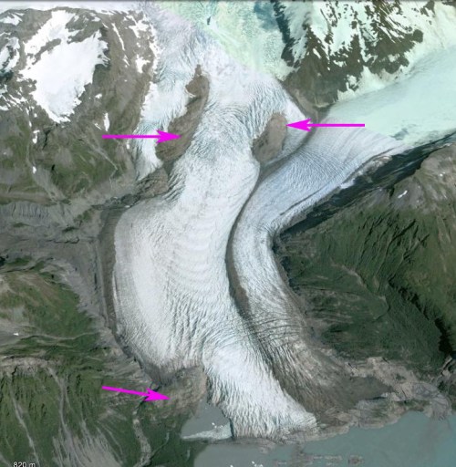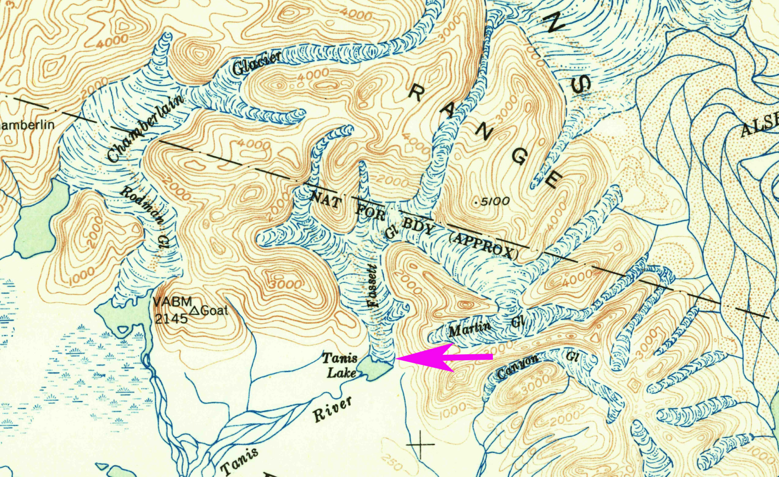 The glacier extended most the way to the southern end of the Tanis Lake in the 1951 Yakutat map. In 1987 the glacier terminated on the northeast shore of Tanis Lake. The calving front in the lake was 800 m wide. The snowline was at 600 m. In mid-June of 2014 the snowline was already at 600 m, by the end of the melt season it was at 900 m. In 2016 the terminus of the glacier no longer reaches Tanis Lake. The eastern side of the terminus is stagnant and ends 200 m from the shore of the lake. The western edge terminates in a new lake that is forming. The average retreat has been 250 m for the glacier from 1987-2016. The larger changes are upglacier of the terminus where large areas of bedrock have been exposed due to retreat, and several segments of the glacier that used to be joined have separated. The snowline is at 850 m in 2016. There are three large areas of bedrock denoted in the 2014 Google Earth image below. The two at 500 m well above the terminus appeared as medial moraines in 1987 and are now bedrock ridges 600 m and 1100 m long. There is a group of ogives extending below these two locations indicating the annual flow rate is 100 m/year in this reach of the glacier. The new lake is also evident in the Google Earth image.
