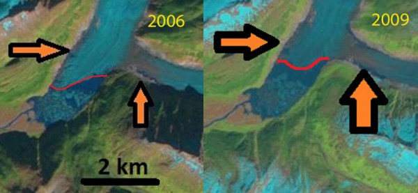 The Gilkey Glacier has not been at tidewater for thousands of years, since the demise of the Cordilleran Ice Sheet. Gilkey Glacier retreat has been large in the last 30 years leading to formation of a large lake and separation from several tributaries.https://blogs.agu.org/fromaglaciersperspective/2015/03/23/widespread-retreat-gilkey-glacier-system-alaska/