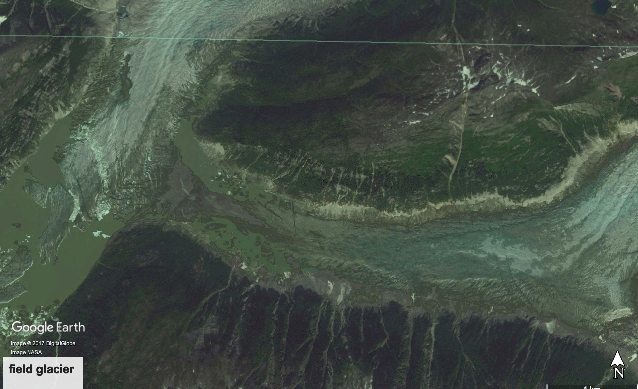 The USGS map from 1948 imagery and the 1984 imagery indicate little change in the terminus position, with only a small lake at the terminus in 1984 with most of the margin resting on the outwash plain. The Field Glacier by 2006 had developed a proglacial lake at the terminus that averaged 1.6 km in length, with the east side being longer. There are several small incipient lakes forming at the margin of the glacier above the main lake, each lake indicated by black and orange arrow. In 2009 the lake had expanded to 2.0 km long and was beginning to incorporate the incipient lake on the west side of the main glacier tongue. There was also a lake on the north side of this tributary. This lake was noted as being poised to soon fill the valley of the south tributary and fully merge with the main, as yet unnamed lake at the terminus, maybe this should be Field Lake. In 2013 Google Earth imagery indicates the fragile nature of the terminus tongue that is about to further disintegrate. From 1984 to 2017 Field Glacier has experienced a retreat of 5300 m of the southern branch and 4050 m of the northern branch. This glacier is experiencing retreat and lake expansion like several other glaciers on the Juneau Icefield, Gilkey Glacier, Eagle Glacier, and Antler Glacier.