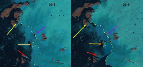 Steenstrup Glacier, Greenland front in 2015 and 2017 illustrating location with respect to the new islands at: Red Head-red arrow, Tugtuligssup Sarqardlerssuua at yellow arrow , and the 2017 new island at orange arrow. Yellow dots indicate icefront and purple arrow another future island to be released from the glacier.
