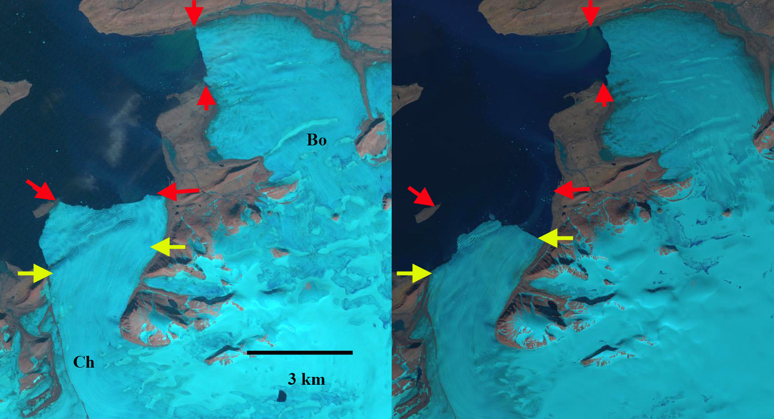 Chernysheva Glacier and Borozova, Novaya Zemlya comparison in 1990 and 2015 Landsat images. Red arrows indicates 1990 terminus and yellow arrow 2015 terminus position. Island has formed at the 1990 terminus position of Chernysheva.