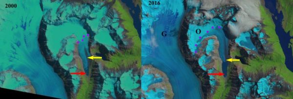Glaciar Olvidado (O) retreat illustrated in 1985 and 2017 Landsat images. Red arrow is 1985 terminus location, yellow arrow is 2017 terminus location and purple dots are the snowline. This illustrates an 1800 m retreat.