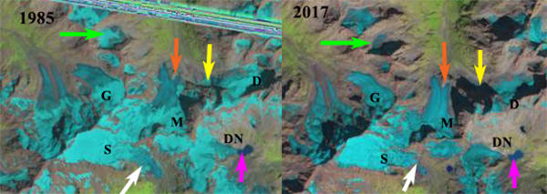 Comparison of glaciers around Gora Gvandra, Caucasus Mountians in 1985 and 2017 Landsat images. G=Gvandra Glacier, D=Dalar galcier, DN =North Dalari Glacier, S=Sakeni Glacier and M=Morde Glacier.
