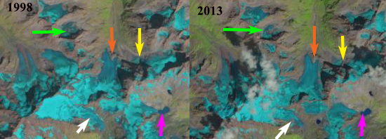 Comparison of glaciers around Gora Gvandra, Caucasus Mountians in 1985 and 2017 Landsat images. yellow arrow=Dalar glacier, pink arrow=North Dalari Glacier, whtie arrow=Sakeni Glacier and orange arrow=Morde Glacier.