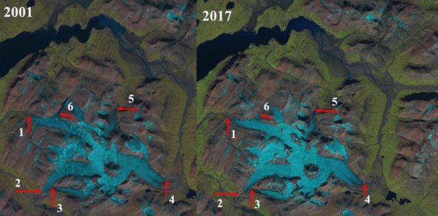 Mityushikha Ice Cap with red arrows indicating six glacier terminus that have retreated from 2001 to 2017 in Landsat images.