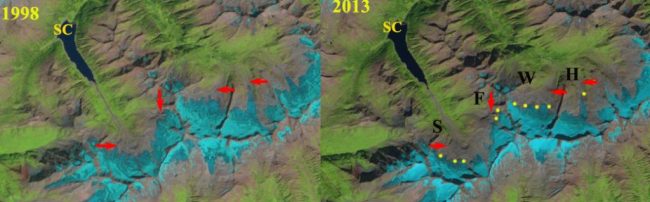 Schlegies (S), Furtschagl (F), Hornkees (H) and Waxeggkees in 1998 and 2013 Landsat images. Red arrows indicate the 1990 terminus location and yellow dots indicate the 2013 terminus.