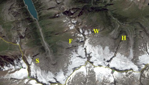Schlegies (S), Furtschagl (F), Hornkees (H) and Waxeggkees In Google Earth image.