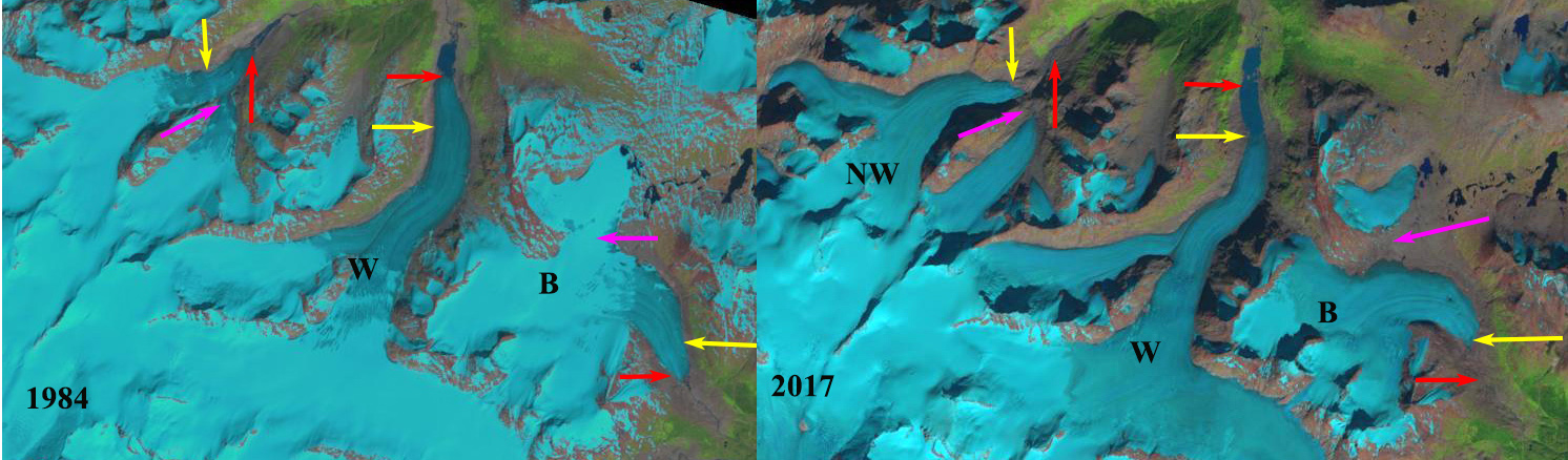 Warm Creek, Norht Warm Creek (NW) and Bighorn (H) Glaciers in Northwest British Columbia in 1984 and 2017. Red arrows are the 1984 terminus location, yellow arrows the 2017 terminus locations and purple arrows where glaciers have separated.