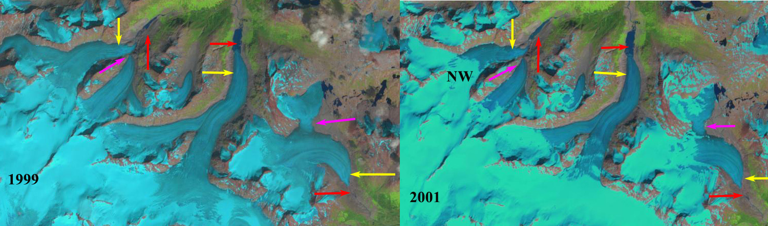 Warm Creek, Norht Warm Creek (NW) and Bighorn (H) Glaciers in Northwest British Columbia in 1999 and 2001. Red arrows are the 1984 terminus location, yellow arrows the 2017 terminus locations and purple arrows where glaciers have separated.