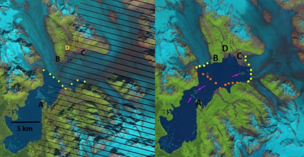 Landsat images from 2016 with terminus indicated by yellow dots. Point A indicates the 1987 terminus location. Main terminus now extends south near Point C. Northern terminus extends west from Point B.Note large iceberg that calved in 2015, pink arrow.