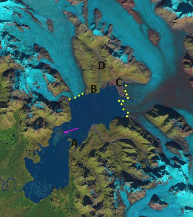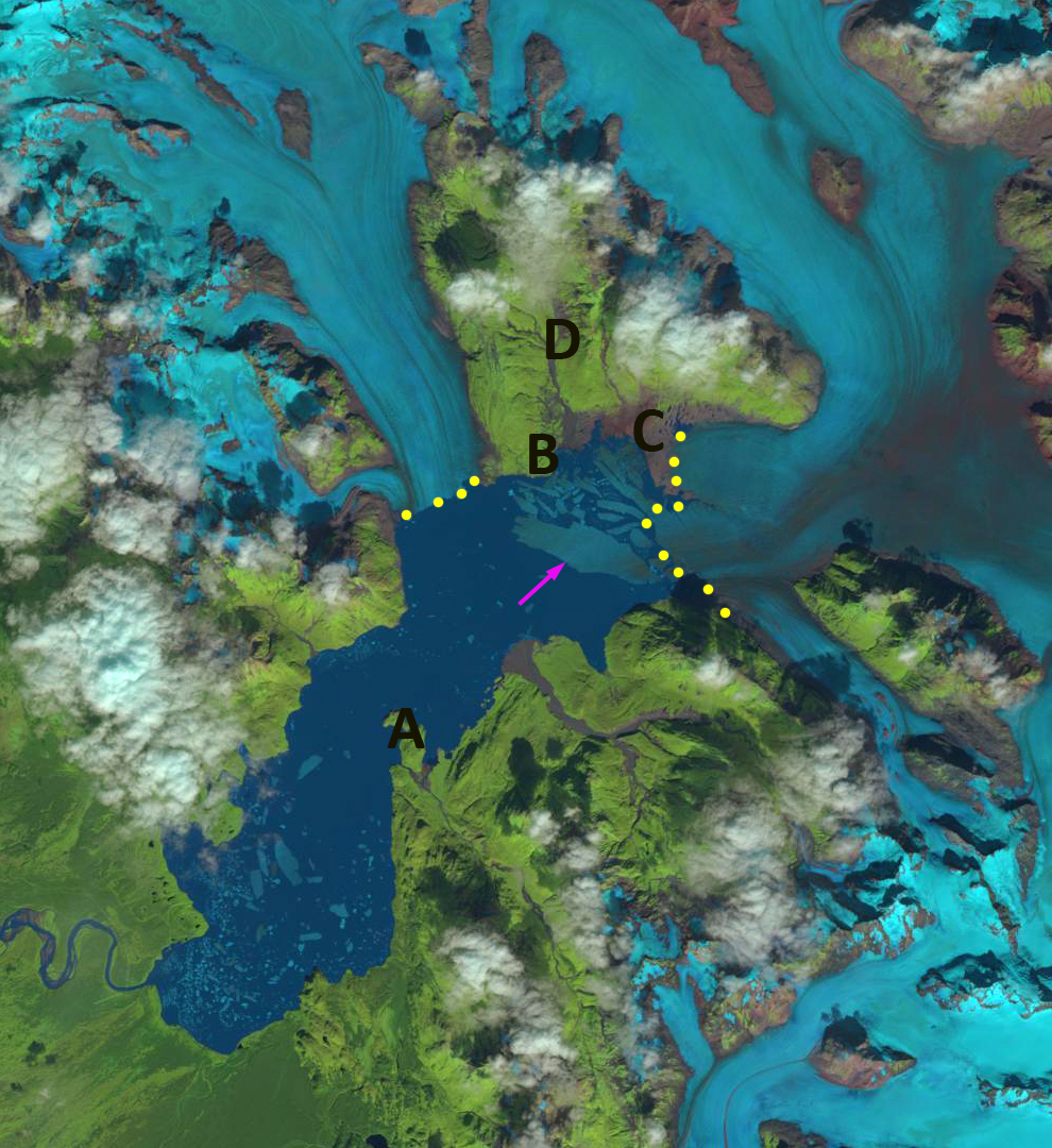 In 2010 the glacier has just retreated from the peninsula at Point A, the valley at D was deglaciated, a small strip of bedrock-sediment was exposed at C from that had been beneath the glacier, and B was still well inland of the terminus. An aerial image of the glacier indicates significant rifting, blue arrows,  in 2010 that leads to the substantial 2013 breakup.  Rifts are not just crevasses, as they typically extend to the base of the glacier along part of the glacier.  They typically form in areas of a glacier that are near flotation.  In this case an area that has thinned until approximate flotation (Benn, Warren ann Mottram, 2007). In 2013 there is a large area of icebergs and melange in front of the terminus, yellow dots. By 2013 the northern arm of the glacier had retreated 6.4 km from the peninsula at A toward the peninsula at B. The central arm of the glacier toward C had retreated 7.5 km and the retreat on the southern edge of the glacier was 6.5 km.  In 2015 the snowline is quite high at 2200 m, leaving very little of the glacier in the accumulation zone. In 2015 a large iceberg detached pink arrow, that is 5 km by ~1 km. In 2016 the snowline is again around 2200 m. From 2013 to 2016 the glacier retreated from Point B to Point C on the northern side and to Point E on the southern side this is a distance of 10.2 km in thirty years since 1987 or 340 m/year. In 2016 the Peninsula extending across the lake from Point C is 2.5 km long. The terminus is resting on this and adjacent shoals across 50% of its width.  The iceberg has diminished to 2.5 km long and 700 m wide, pink arrow.  The northern terminus extending west from Point B has changed little from 2013-2016. The 2018 image compares the 2010 position (yellow dots) with 2018 (orange dots), indicating an area of 45 km² lost.  The main terminus retreated 7 km. There are some small icebergs in 2018.  The ability to produce icebergs as large as in 2015 has been lost as the calving front has been restricted by the Peninsula which is now 3 km long, leaving less than a 3 km wide calving front.   The narrower calving front and reduced water depth should in the short term reduce retreat. The northern terminus near Point B has experienced limited retreat since 2013.