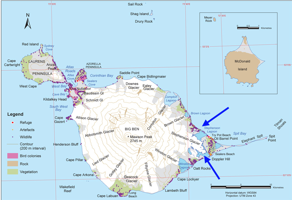 The AAD has a number of images in their gallery of Heard Island glaciers including Stephenson Glacier. The climate station at Atlas Cove indicates a 1 C temperature rise in the last 60 years. The AAD will also certainly be looking at how this new lagoon impacts the local seal and penguin communities. The population of king penguins increased sharply from the 1940’s into the 21st century, while rockhopper, gentoo and macaroni penguins numbers declined over the same period (AAD, 2019).The map below indicates the importance of Stephenson Lagoon and Winston Lagoon for wildlife, king penguins and cormorants are noted by AAD. The retreat of this glacier follows the pattern of glacier retreat at other glaciers on islands in the circum-Antarctic region Cook Ice Cap, Kerguelen Island , Hindle Glacier and Neumayer Galcier, South Georgia.