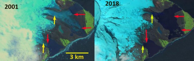 Retreat of Stephenson Glacier and Winston Glacier from 2001 (red arrows) to 2018 (yellow arrows) in Landsat images.