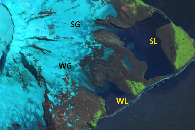 Stephenson Glacier (SG), Sephenson Lagoon (SL), Winston Glacier (WG) and Winston Lagoon (WL) in 2019 Sentinel Image.