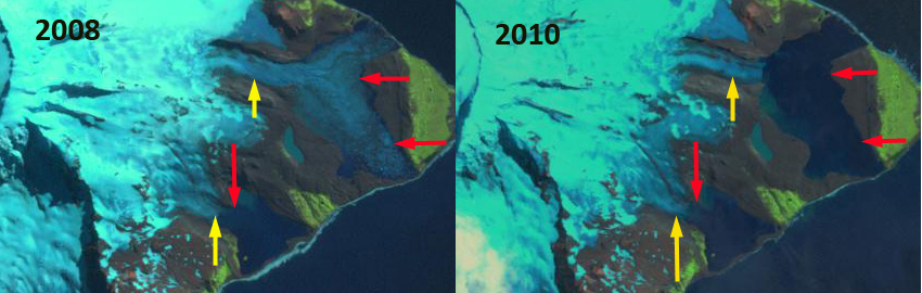 Stephenson Glacier and Winston Glacier in Landsat images from 2008 and 2010. Terminus location of 2001 red arrows and terminus location in 2018 at yellow arrows.