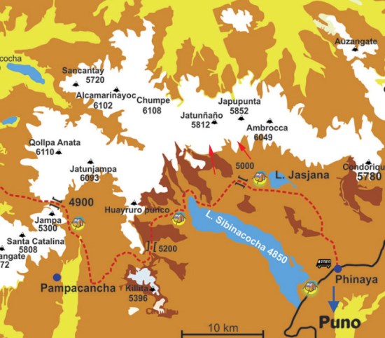 Trekking map of the region, red arrows indicate the Soranano Glaciers