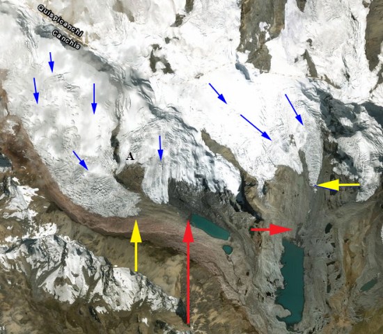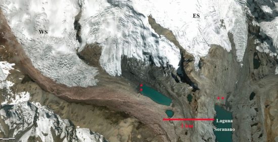 In 1995 the western Soranano Glacier terminates in a proglacial lake at 5000 m the eastern glacier terminates just north of Laguna Soranano also at ~5000 m. Point A is encircled by the two lobes of the western Soranano Glacier. By 2000 there is minor retreat of both glaciers. By 2018 the western Soranano Glacier has separated into two lobes, with the former rock knob at Point A now the separating rib. The glacier has retreated 800 m since 1995, which is 20% of its 4 km length in 1995. The eastern Soranano Glacier has retreated 700 m and has also separated into two lobes. A new small lake has formed in front of the western lobe.