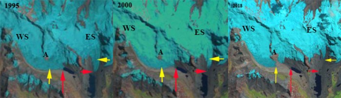 Western Soranano (WS) and Eastern Soranano Glacier (ES) in 1995 and 2000 Landsat images and 2018 Sentinel image, with red arrows indicating the terminus in 1995, and yellow arrows the 2018 terminus.