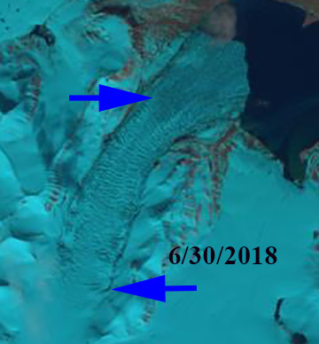 Arnesenbreen in Landsat image from6/3/2018 indicating zone of most extensive crevassing.