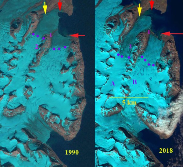 Arnesenbreen (A) and Bereznikovbreen (B) in 1990 and 2018 Landsat images.  Red arrow is 1990 terminus location, yellow arrow the 2018 terminus location and purple dots the transient snowline.