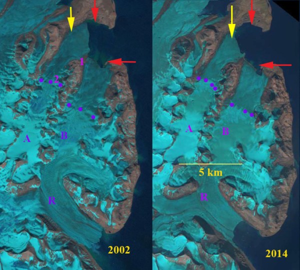 Arnesenbreen (A) and Bereznikovbreen (B) in 2002 and 2014 Landsat images.  Red arrow is 1990 terminus location, yellow arrow the 2018 terminus location and purple dots the transient snowline.