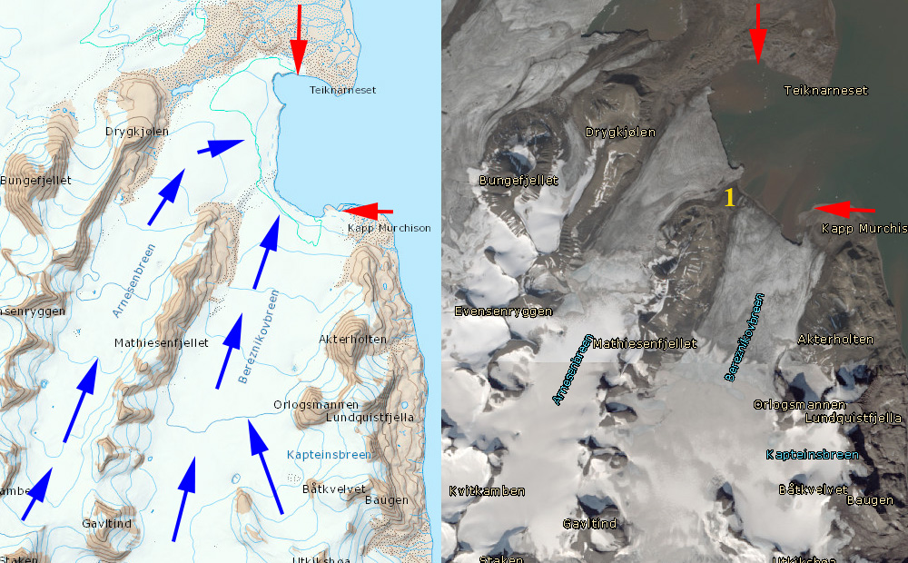 Arnesenbreen (A) and Bereznikovbreen (B) in Toposvalbard map and recent Landsat imagery from Toposvalbard.