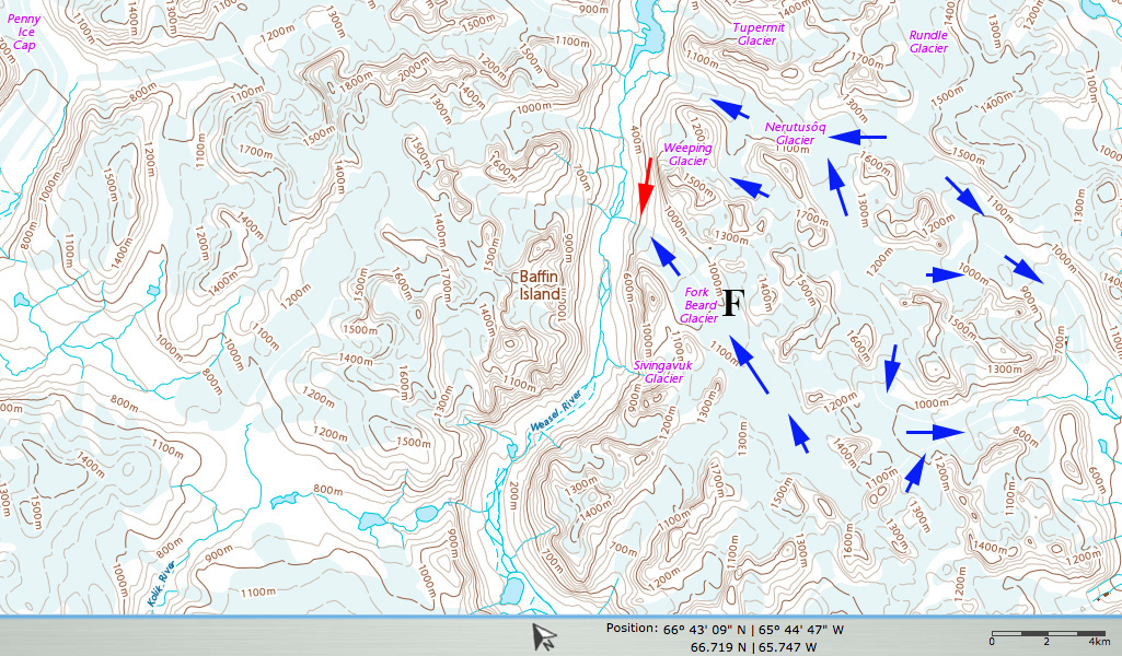 Map of the region indicating flow on Fork Beard, Nerutusoq and two unnamed adjacent glaciers. Red arrow indicates 1990 terminus of Fork Beard at top of steep bench.