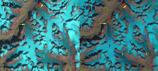 Fork Beard (F) and Nerutusoq Glacier (N), Baffin Island in 1990 and 2018 Landsat images. Red arrow indicates 1990 terminus, yellow arrow 2018 terminus, purple dots the snowline.