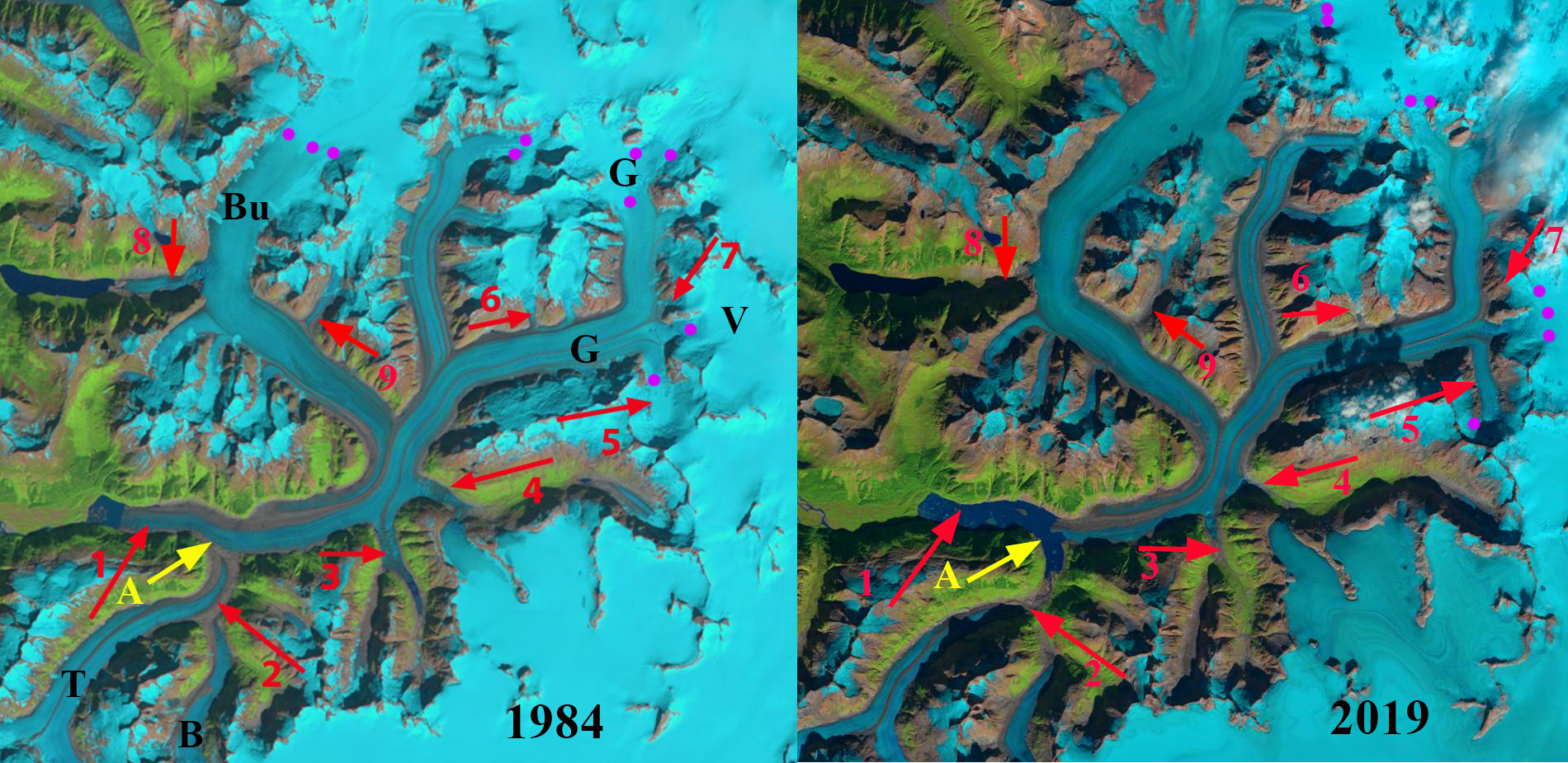 Gilkey Glacier in 1984 and 2019 Landsat images indicating retreat of 4300m, tributary separation and 5 km2 lake expansion. A=Terminus tongue, B=Battle, Bu=Bucher, G=Gilkey, T=Thiel, V=Vaughan Lewis. Snowline=purple dots.