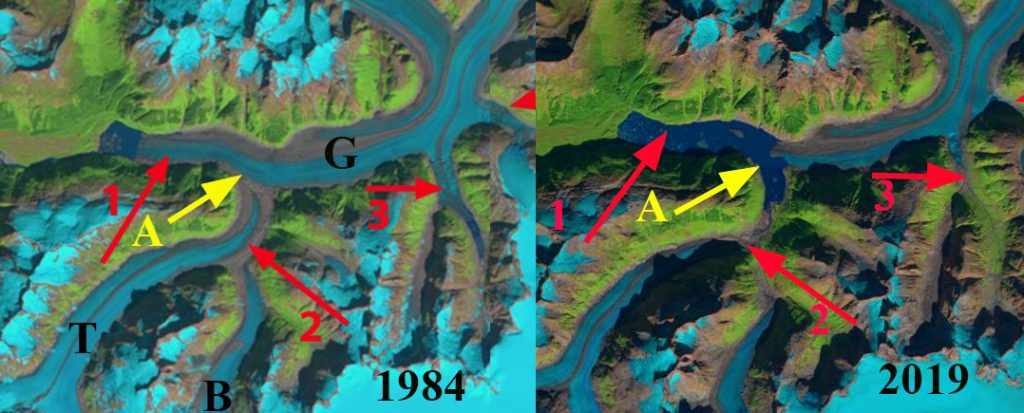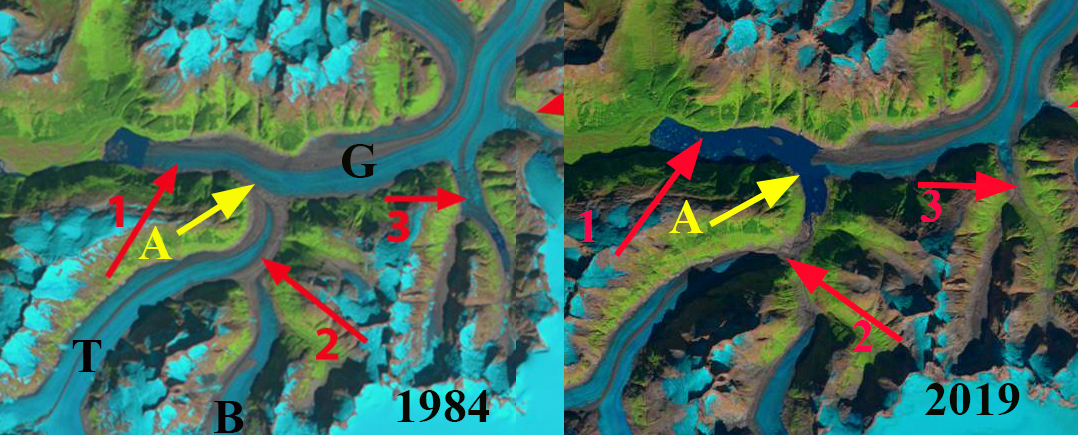 Gilkey Glacier in 1984 and 2019 Landsat images indicating retreat of 4300m, tributary separation and 5 km2 lake expansion. A=Terminus tongue, B=Battle Glacier, G=Gilkey Glacier and T=Thiel Glacier.
