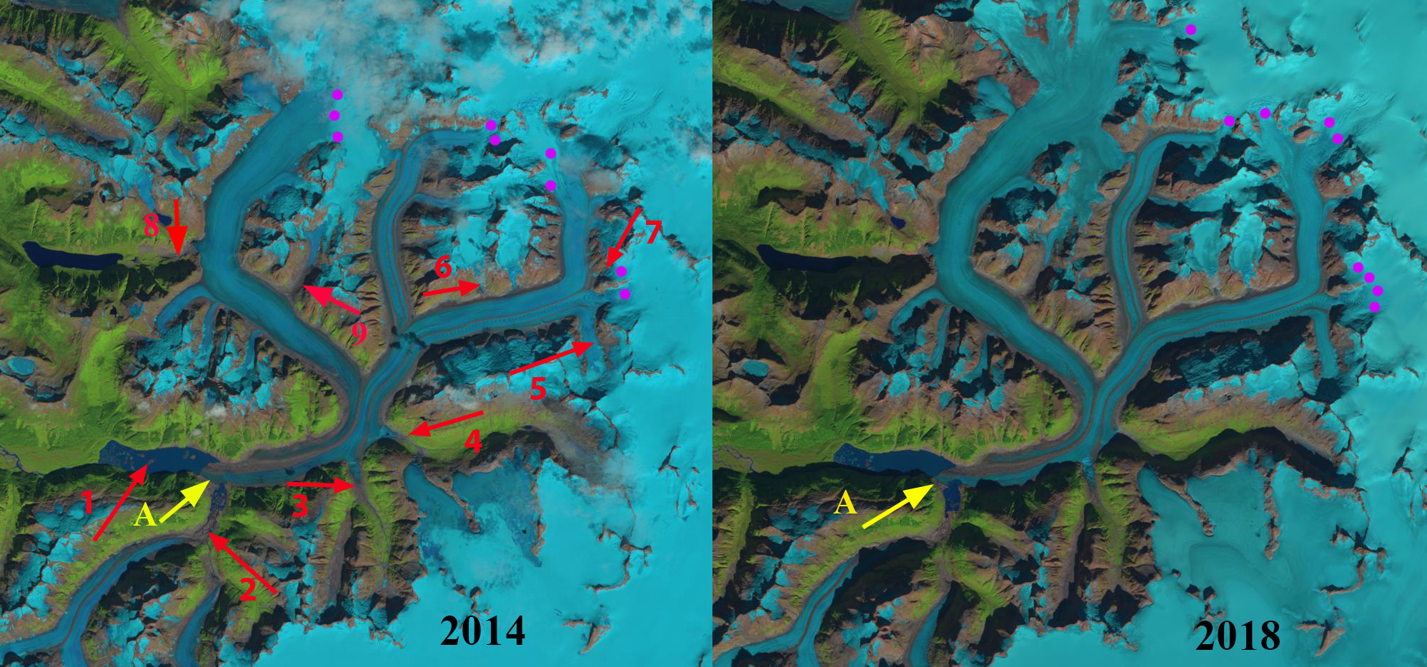 Gilkey Glacier in 2014 and 2018 Landsat images indicating retreat, snowline elevation and lake expansion.
