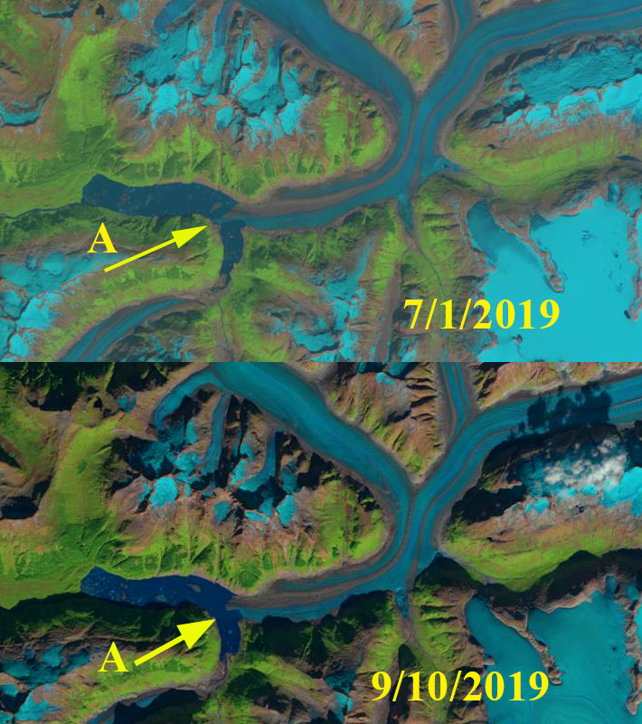 In 2018 and 2019 the snowline on the Juneau Icefield has been the highest of any year since observations began in 1984. This will accelerate mass loss and lead to continued extensive retreat. In 2018 the snowline was at 1600-1650 m on Sept. 16. In 2019 the snowline on Gilkey Glacier was 1650-1700 m on Sept. 10. In July of 2019 the terminus tongue of the glacier reached across the junction of the Gilkey and Battle Valley, separating the two proglacial lakes. By September 10, the glacier tongue had broken off leading to the two lakes joining expanding the size of the proglacial lake to 6.5 km2. The terminus has retreated 4300 m since 1984, while the lake has increased in size by more than 400%. The retreat will continue leading to additional lake expansion just as is occurring at Meade and Field Glacier.