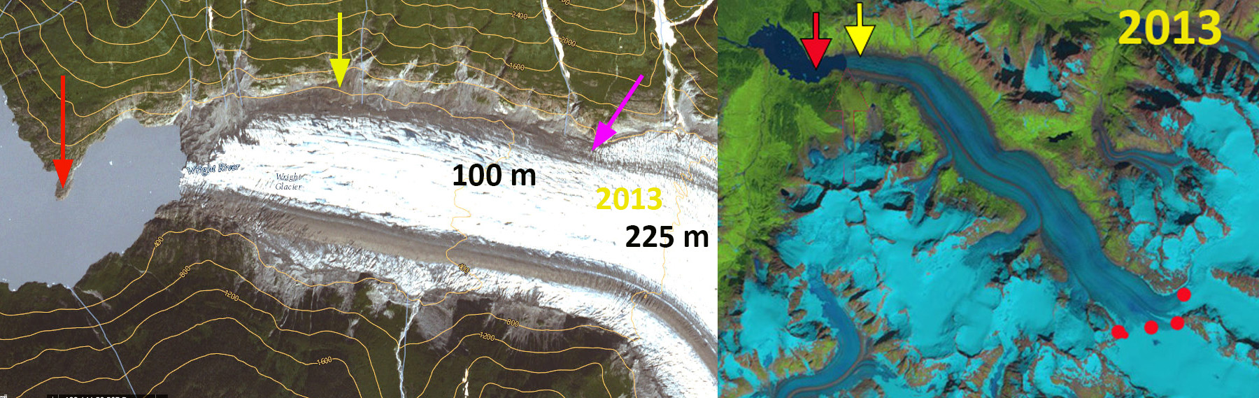 Wright Glacier in 2013 Landsat images and USGS Topo imagery. The red arrow indicates 1984 terminus location, yellow arrow 2019 terminus location, pink arrow where the surface slope steepens and red dots indicate the snowline.