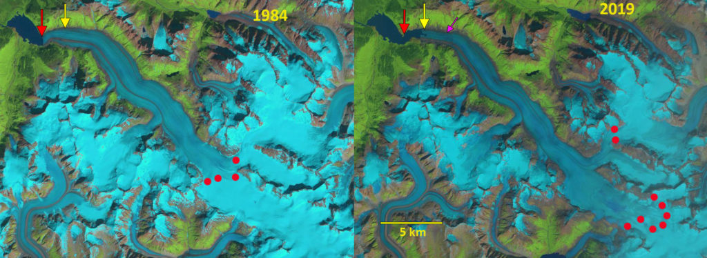 Wright Glacier in 1984 and 2019 Landsat images. The red arrow indicates 1984 terminus location, yellow arrow 2019 terminus location, pink arrow where the surface slope steepens and red dots indicate the snowline.