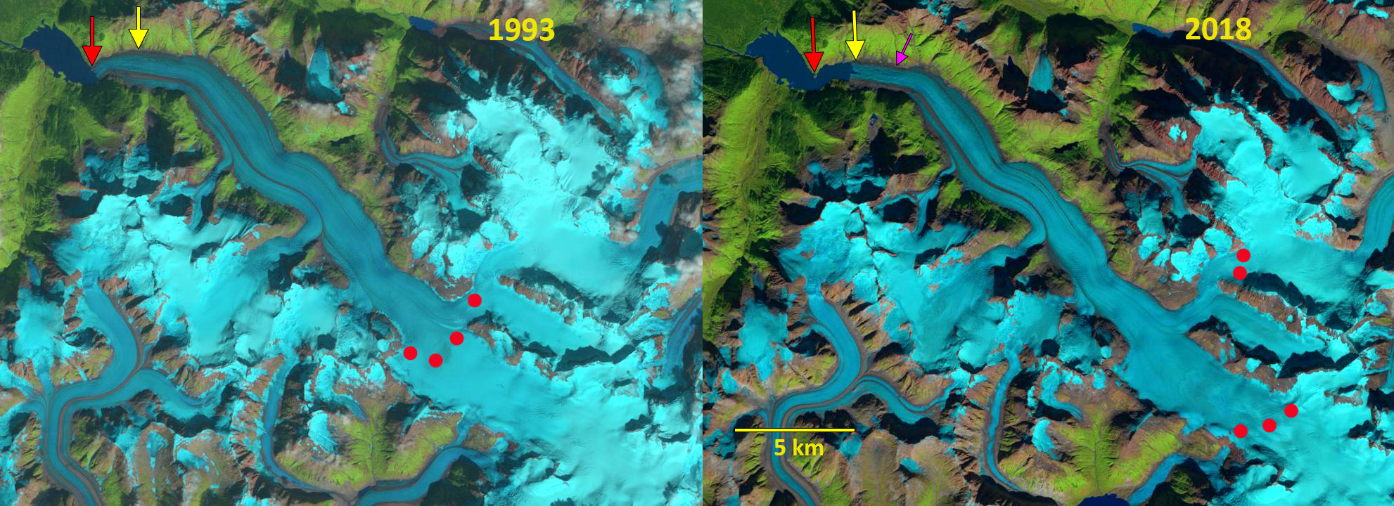 Wright Glacier in 1993 and 2018 Landsat images. The red arrow indicates 1984 terminus location, yellow arrow 2019 terminus location, pink arrow where the surface slope steepens and red dots indicate the snowline.
