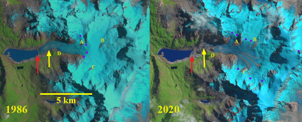 Calluqueo Glacier in Landsat images from 1986 and 2020. Yellow arrow is the 2020 terminus location, red arrow the 1986 terminus location, purple dots indicate the snowline. Point A-D indicate bedrock areas that have expanded with glacier thinning.