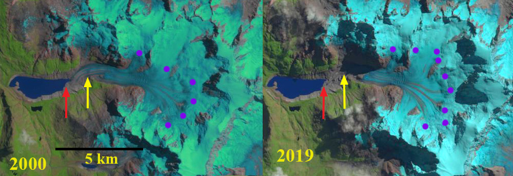 Calluqueo Glacier in Landsat images from 2000 and 2019. Yellow arrow is the 2020 terminus location, red arrow the 1986 terminus location, purple dots indicate the snowline.