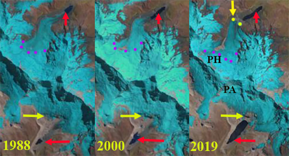 Retreat and lake expansion at Pacliash Glacier (PH) and Palcaruja Glacier in the Cordillera Blanca, Peru illustrated with 1988, 2000 and 2019 Landsat images.  Red arrow is the 1988 terminus, yellow arrow the 2019, purple dots are the snowline.