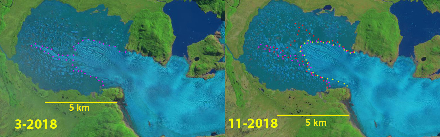 San Quintin in March and November 2018 Landsat images indicating loss of narrow terminus tongue pink dots.