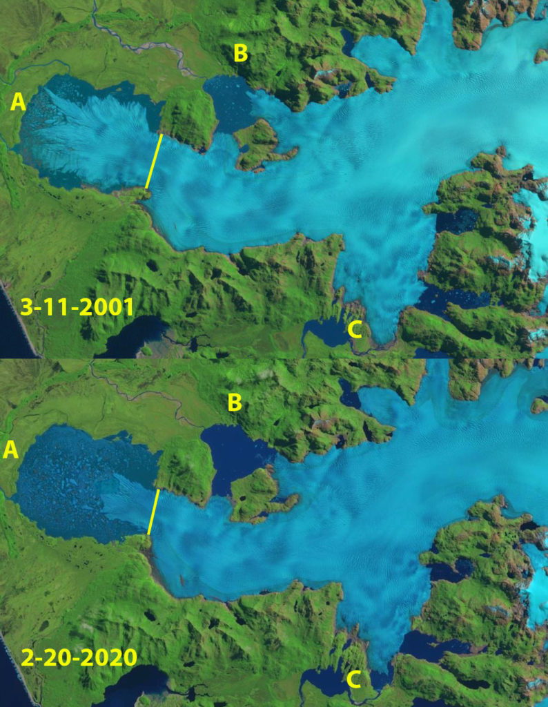 Landsat images of San Quintin Glacier from 2001 and 2020 indicate the expansion of both Lake A and Lake B due to glacier retreat. The Lake A basin as defined by the transect at the eastern narrow point, yellow line, has a total area of 41 km2 with the lake surface area now comprising 35.1 km2.