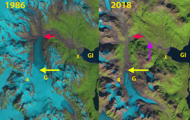 Geikie Glacier (G) in 1986 and 2018 Landsat images. Pink arrow is the 1954 terminus, red arrow the 1986 terminus and yellow arrow the 2018 terminus location. GI is Geikie Inlet which the glacier withdrew from 110 years ago.